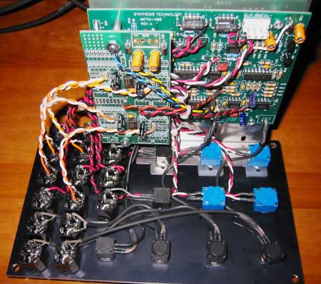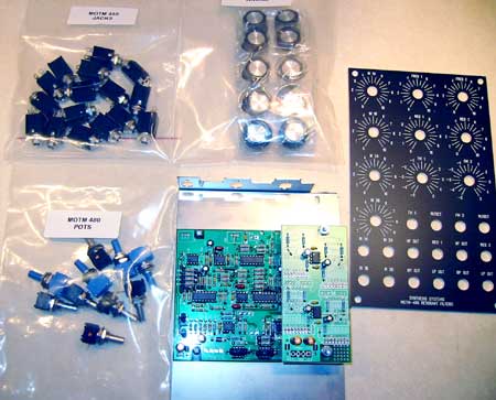 - Mount the MOTM PC board to the bracket, and the front panel to the bracket. The panel is held by three pots. Make sure each pot has a nut behind the panel as well as in front. Start wiring from the bottom up: