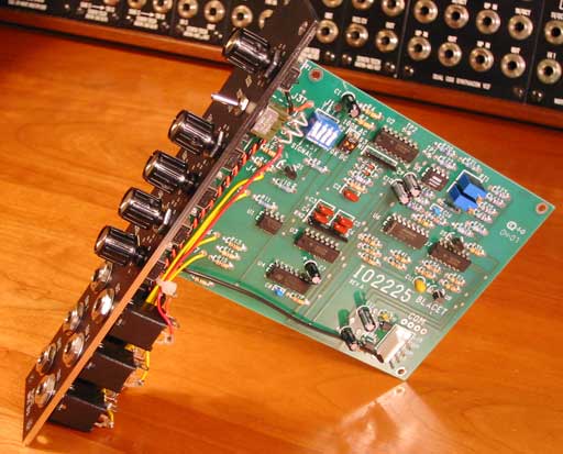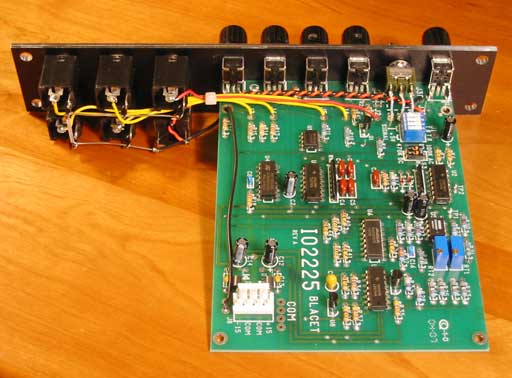 This module fits neatly into a 1U MOTM style Front Panel Express panel with the board mounted directly by the pot bushings. I replaced the polyswitchs on the power inputs with ferrite beads. The panel knobs are ALCO PKG50B1/4.
