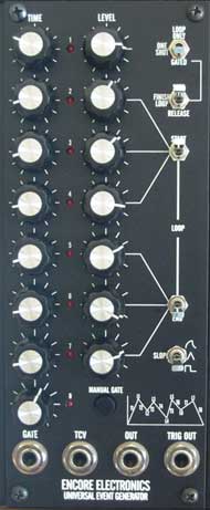 The Encore Universal Event Generator is a Synthesis Technology, MOTM compatible module designed to be a versatile and useful addition to an already great modular system. The UEG can be used as an envelope generator, a complex LFO, or as a step sequencer.