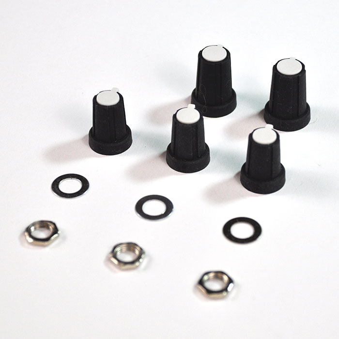 You can order Rogan knobs similar to those used by Mutable Instruments on Synthcube. The trick was guessing the sizes to order. I chose 2PS medium skirted d-shaft and 3PS large skirted d-shaft knobs, ordering two of each. Whoops. I should have ordered 1PS small skirted d-shaft instead of the 2PS medium. Turns out that the 2PS are taller and match pretty closely to those used on Braids and Clouds. The 3PS was the correct size as the original for the Frequency, but when placed next to a 2PS medium on the FM they were too close together. So I used both of the 2PS medium knobs on those pots, which are on the top. The bottom ones were already white on the original.