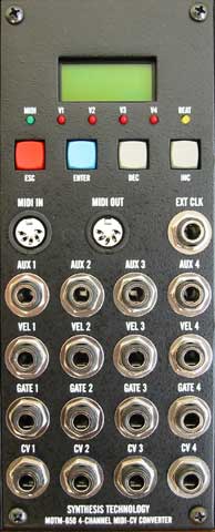 The MOTM-650 is a 2U wide, full-featured 4-channel MIDI-CV converter. Features include: