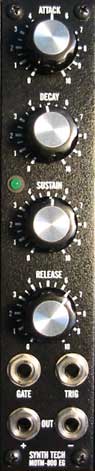 The MOTM-800 provides the standard ADSR (Attack, Decay, Sustain, and Release) envelope for controlling VCAs, filters, and other CV inputs. Both positive-going (0V to +5V) and negative-going (0V to -5V) envelopes are simultaneously available.