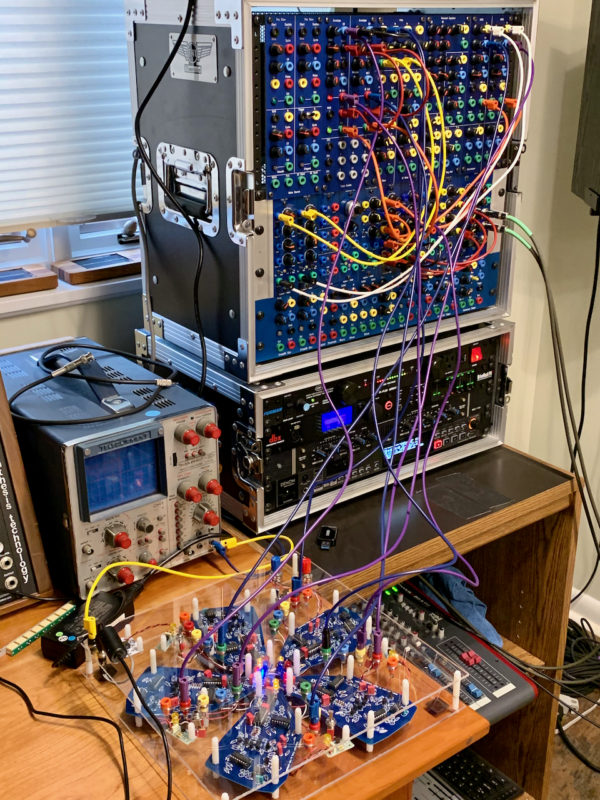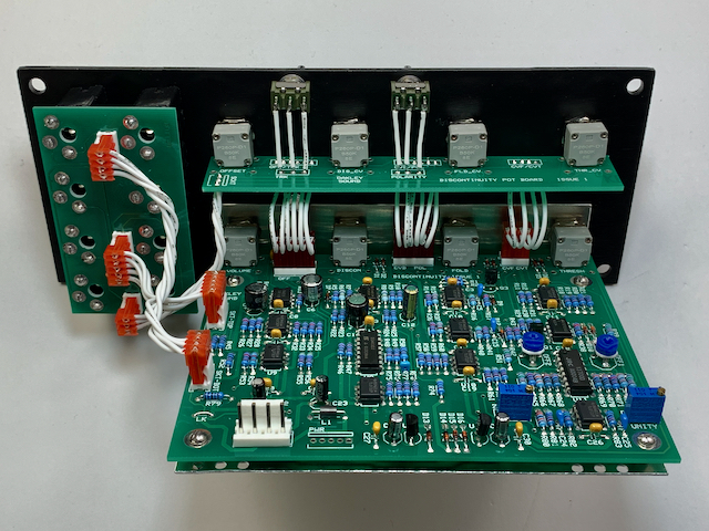 This is one of five petals that will make up a full quantussy. In the full configuration the petals can cross-modulate each other. Notice the green 16-pin header, mounted in place of the CD4052 chip. The 4052 selects one of the other petals for modulation purposes, and since it has nothing to do in this single board test, it’s replaced by this header that grounds the pins of the 4052 outputs that are buffered by op amps.
