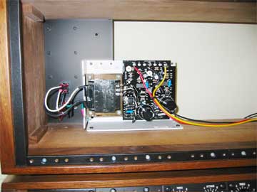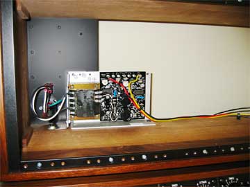 Note the position of the MOTM-900 power supply, located to the right end of the cabinet. I removed the wood back, slid it over just the width of the MOTM-900, and refastened it. (Eventually, I removed the wood back completely for ventilation and ease of access.) I mounted MOTM-900 with wood screws. Also note that the power distribution board of the MOTM-900 faces to the left with convenient exposure to the modules. The MOTM-900 is positioned in a normal upright position from the rear. It you tried to mount it as-is on the left it would be upside down or the distribution board would be hidden behind the power supply chassis from the module area. If you use the MOTM-900 supply, I recommend mounting the new way (below). There is a MOTM-960 power distribution board mounted just behind those modules. You can see the wire going to it from the MOTM-900.