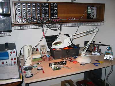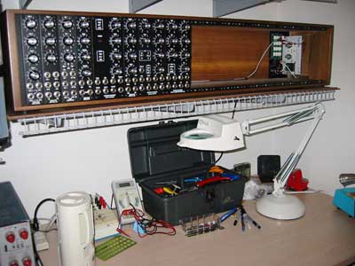The mounting rails from Larry Hendry made it all possible. The photo above shows my workbench in 2002. This is how the first cabinet looked before adding mounting rails. I temporarily fastened up some modules with the wood screws supplied with the dot com cabinet. You could do it this way and just forget the rails. But rails make it simple to remove and relocate modules. The rails are strong steel and use machine screws 8-32 x 1/4″. These are similar to the mounting screws supplied with MOTM, but shorter. The 3/8″ length is too long because of wood behind the machined holes in the rails when installed on these cabinets.